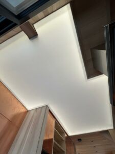 Dans ce chalet d’exception situé à l’Alpe d’Huez, ALPES PLAFOND a réalisé la pose d’une toile tendue rétroéclairée, conçue sur mesure pour sublimer l’espace. Cette solution apporte une lumière douce et homogène, tout en renforçant l’atmosphère chaleureuse et contemporaine du lieu.